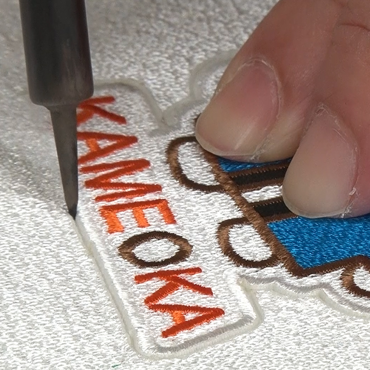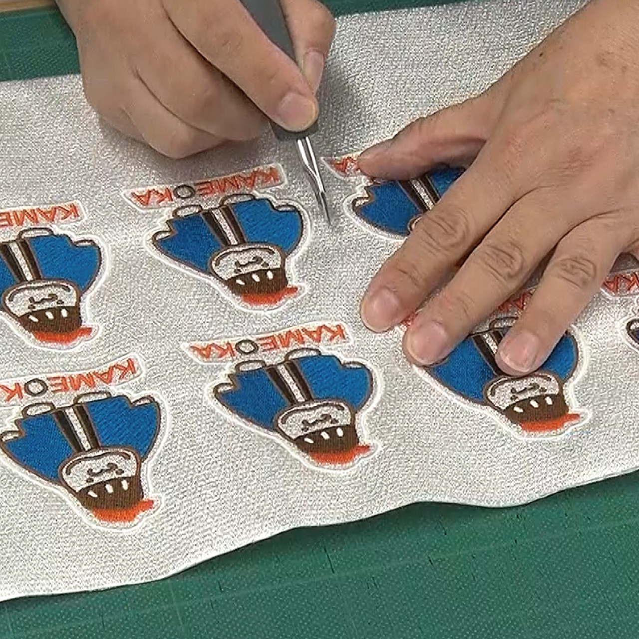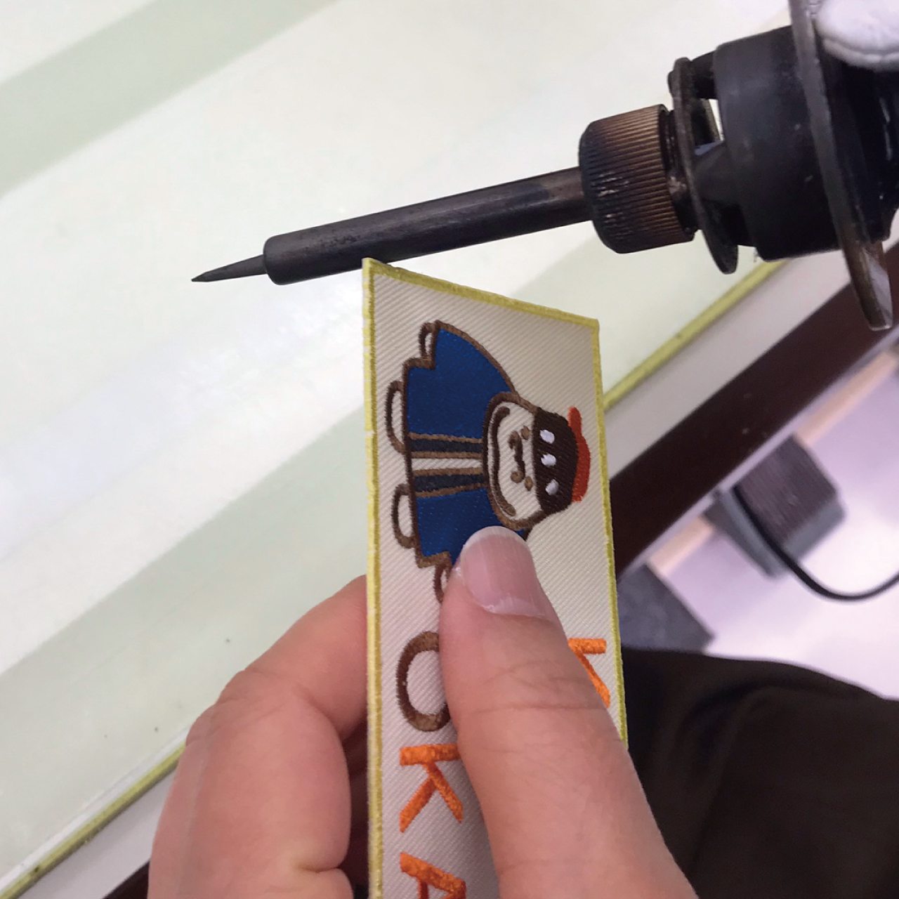 ワッペンは、刺繍を施した生地をカットして作ります。そのままでは生地の繊維がほつれたり、端が毛羽立ったりしてしまうため、熱で縁を焼き切って処理する「ヒートカット加工」でふちを整えます。