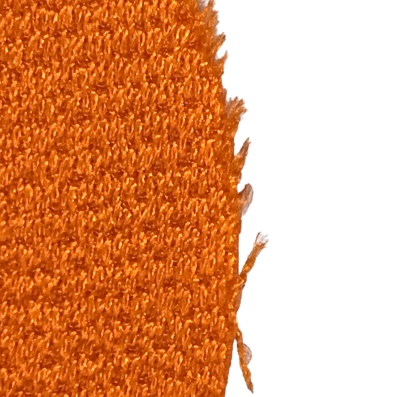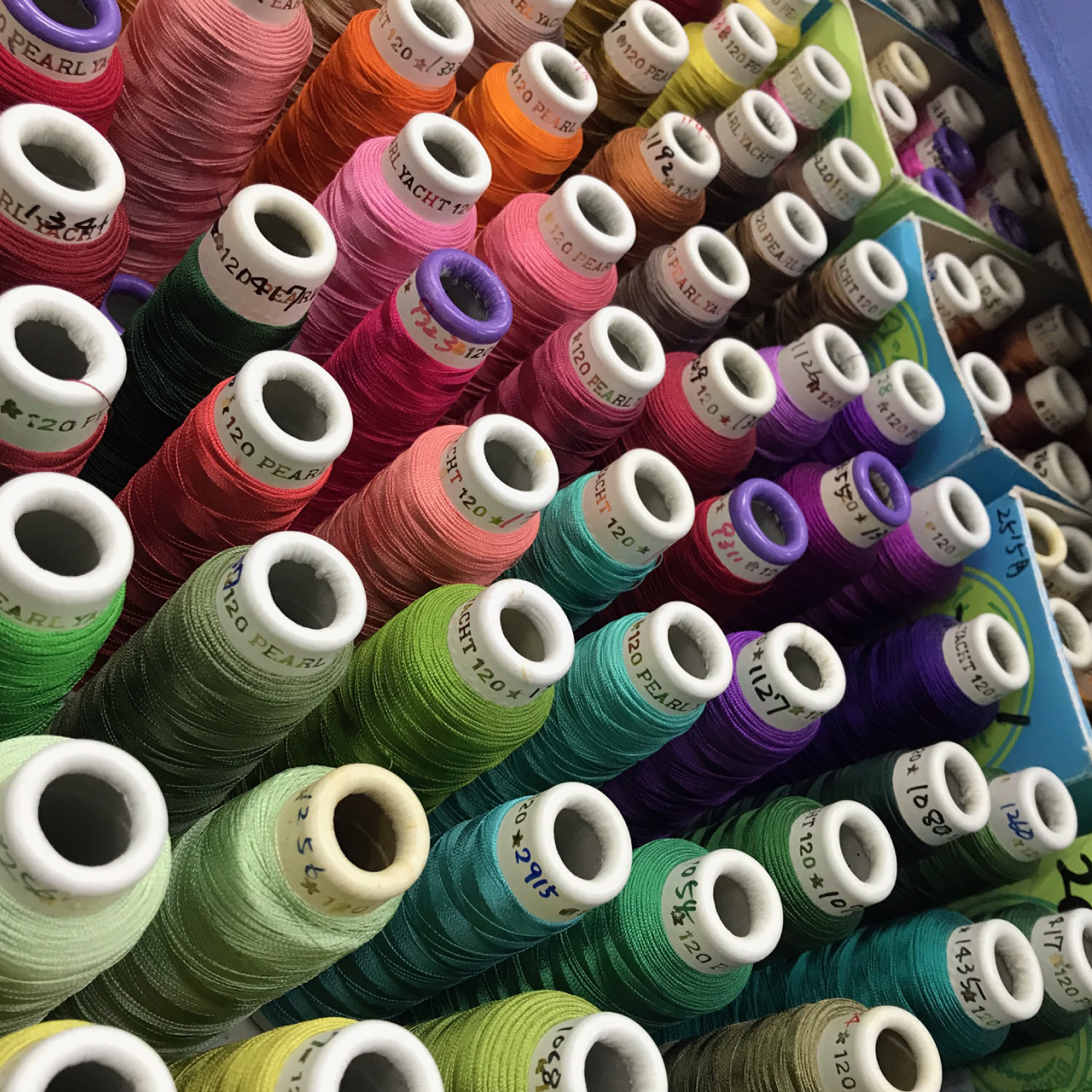 ヒートカットは高温処理のため、熱に弱い糸(ポリエステルなど)は溶けてしまいます。そのため、周囲のサテン縫いには熱に強いレーヨン糸を使用する必要があります。糸色に制限がある点もご留意ください。