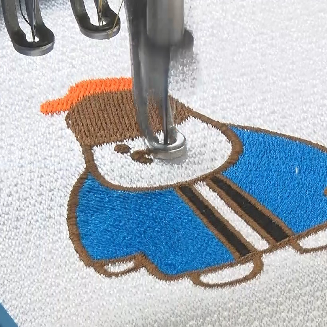 専用刺繍機を用いて、一針ずつ丁寧に刺繍を施します。熟練の技術と最新設備により、美しく精密な表現を実現します。