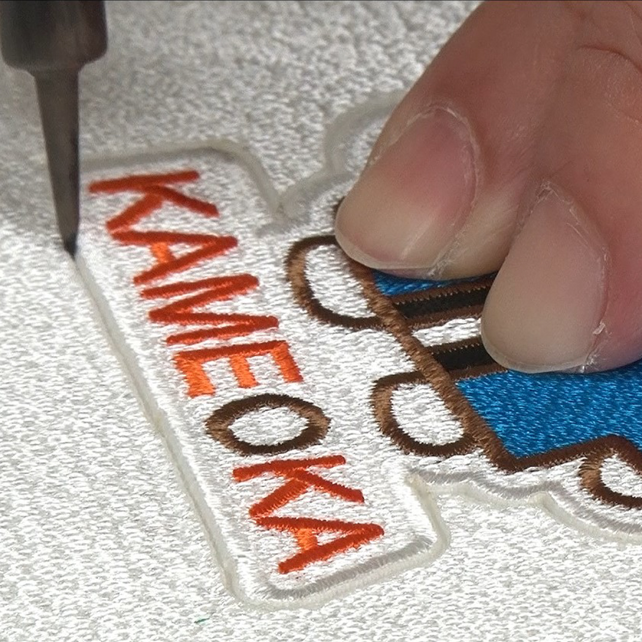 刺繍後にワッペンの強度を高めるため、裏面に専用の生地を貼ります。耐久性を確保し、長期間安心してご使用いただけるように仕上げます。