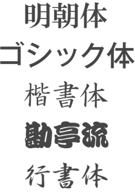 - 用途やご希望の雰囲気に合わせて最適なフォントをご提案します。会社名や団体名にはゴシック体、学校や式典には明朝体、ブランドロゴには筆記体などがよく選ばれています。