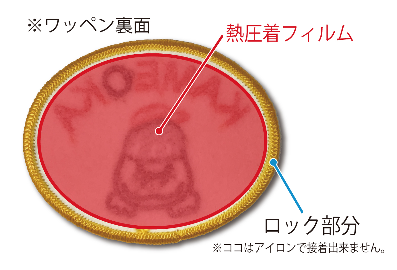 ロック加工は、ワッペンの縁を最後に糸でかがって仕上げるため、ロック部分の裏側には熱圧着フィルムを貼ることができません。その結果、ワッペン全体をアイロンで圧着した場合でも、大外のロック部分だけは接着されない状態になります。