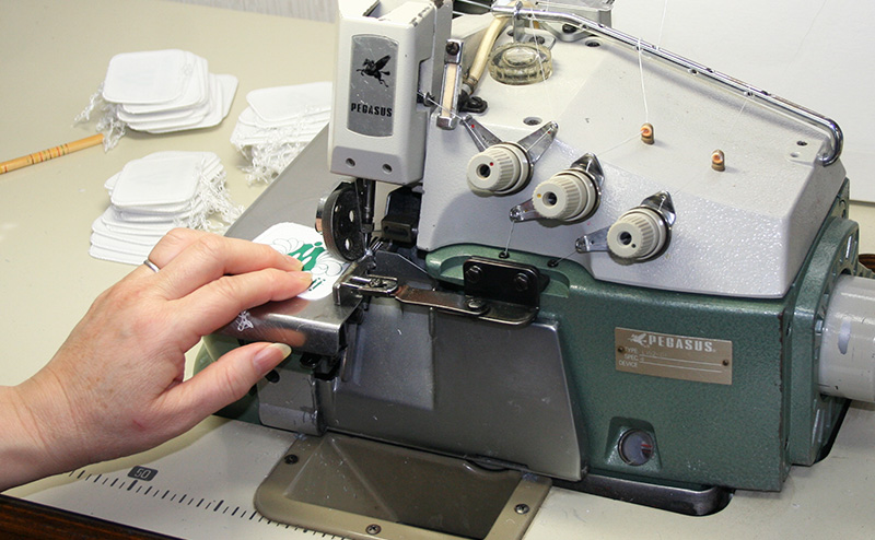 専用の抜き型で生地を裁断した後、側面を糸で巻き込むことで、丈夫で立体的な仕上がりになります。