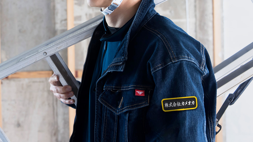 現場作業用ブルゾン・ポロシャツなどに耐洗濯仕様の刺繍ワッペンを採用。